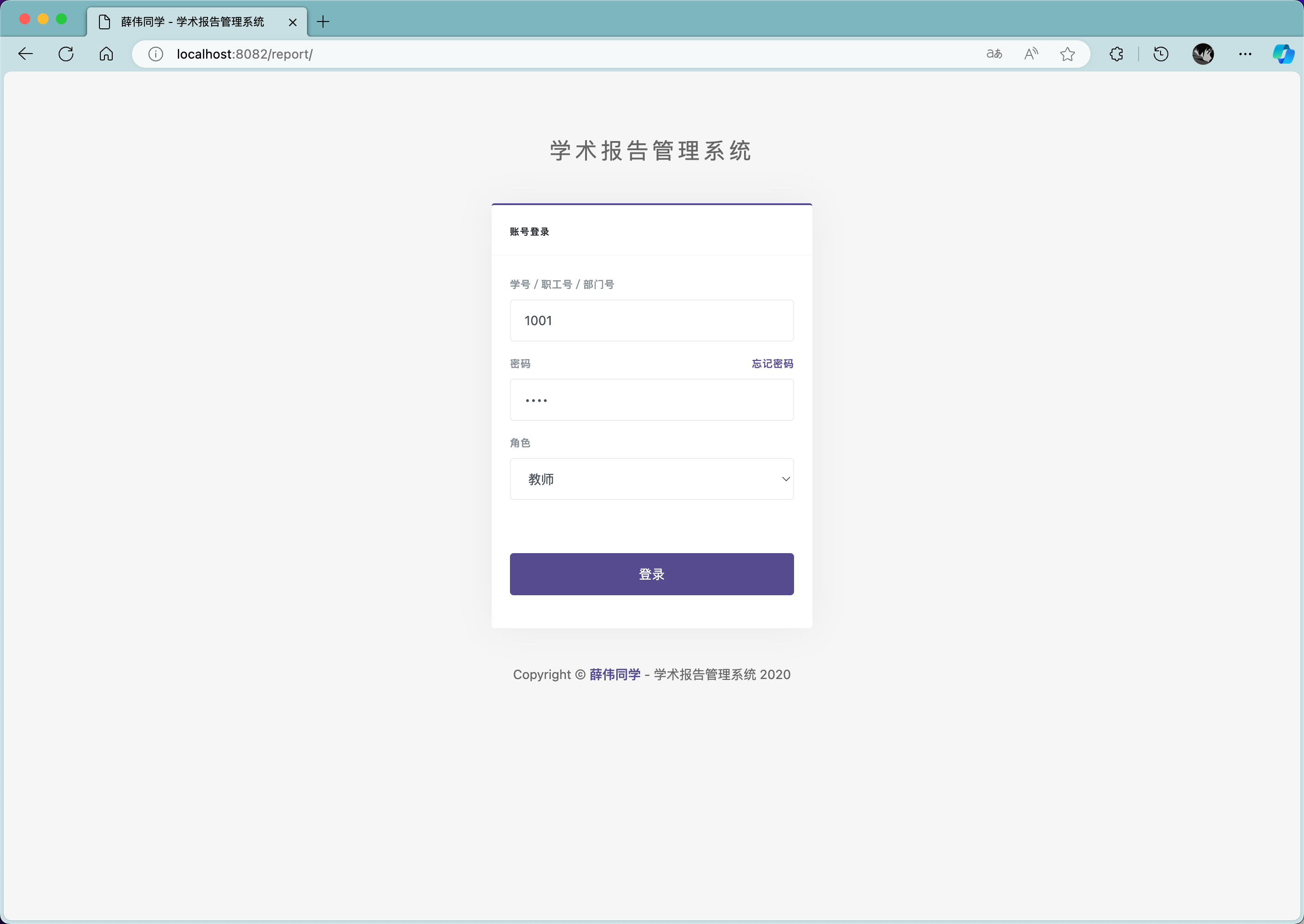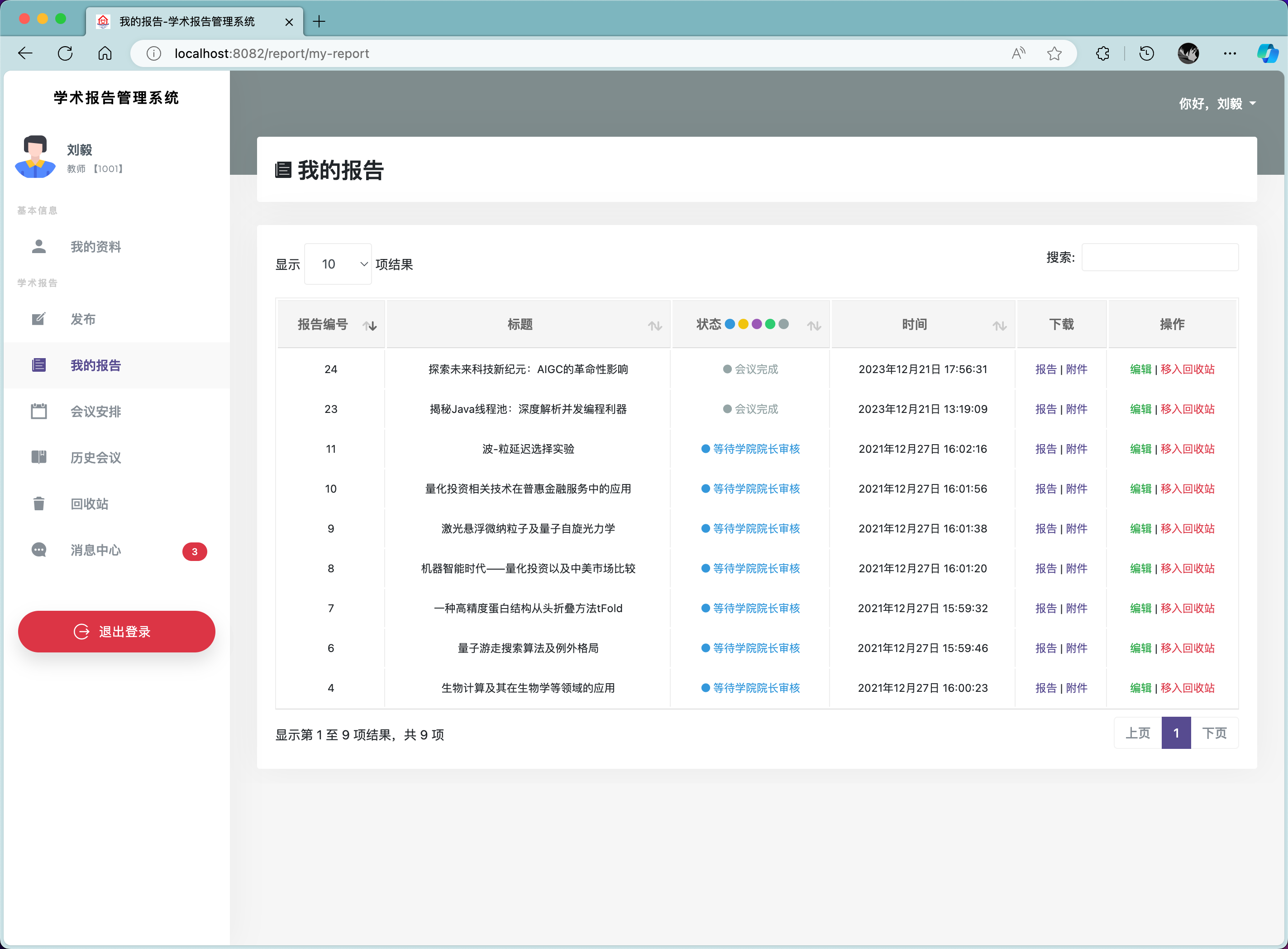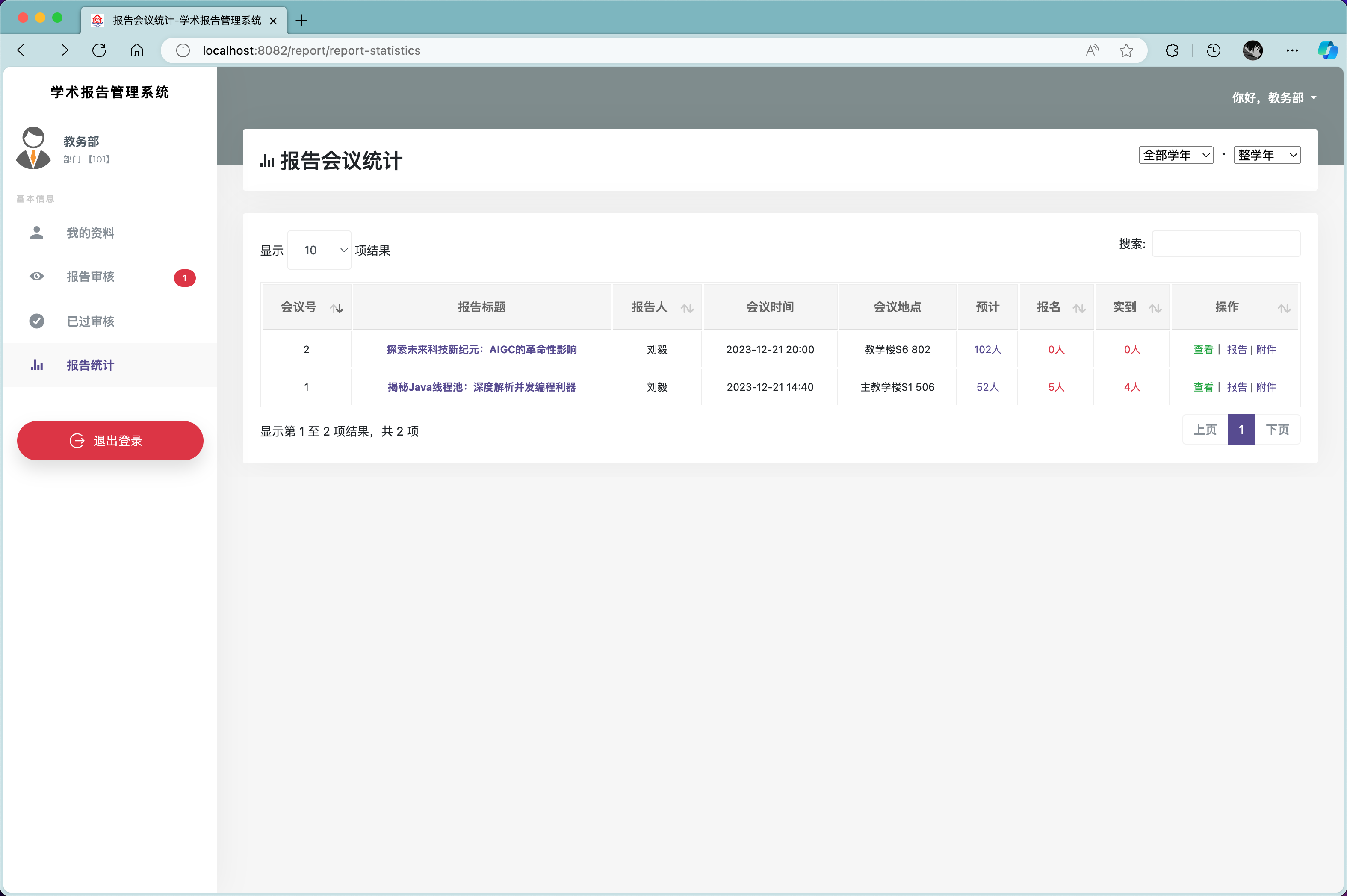 | 报告审核 | 查看本院教师提交的学术报告列表、查看报告详情、下载报告材料以及附件、审核报告并填写意见(通过/驳回) |