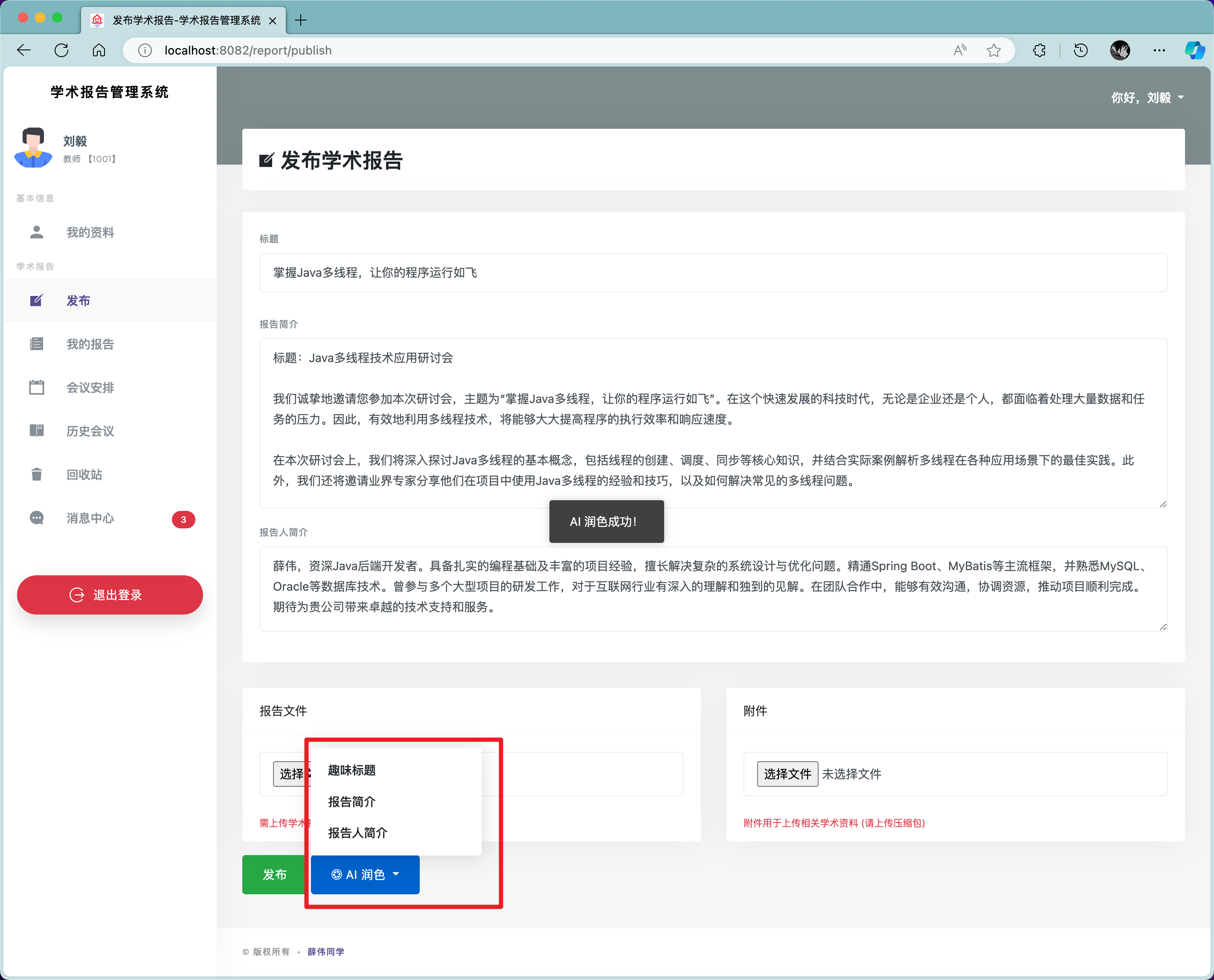 智慧高校学术报告系统(academic-report)是一个基于 SpringBoot 开发的标准 Java Web 项目。**系统整体页面设计简约大气,巧妙融合了目前备受瞩目的 AIGC 生成式 AI 技术,选择了阿里通用千问大语言模型,以智能生成趣味报告标题和润色报告内容等方式,提升系统的整体品味。**系统涵盖了丰富的 Excel 表格操作功能,支持信息的高效导入和导出。整个系统设计完善,内置了复杂的审核流程,旨在为高校提供一套信息化管理的优质解决方案。该系统不仅易于初学者理解和学习,而且在学校项目答辩和毕业设计等场景中表现出色。