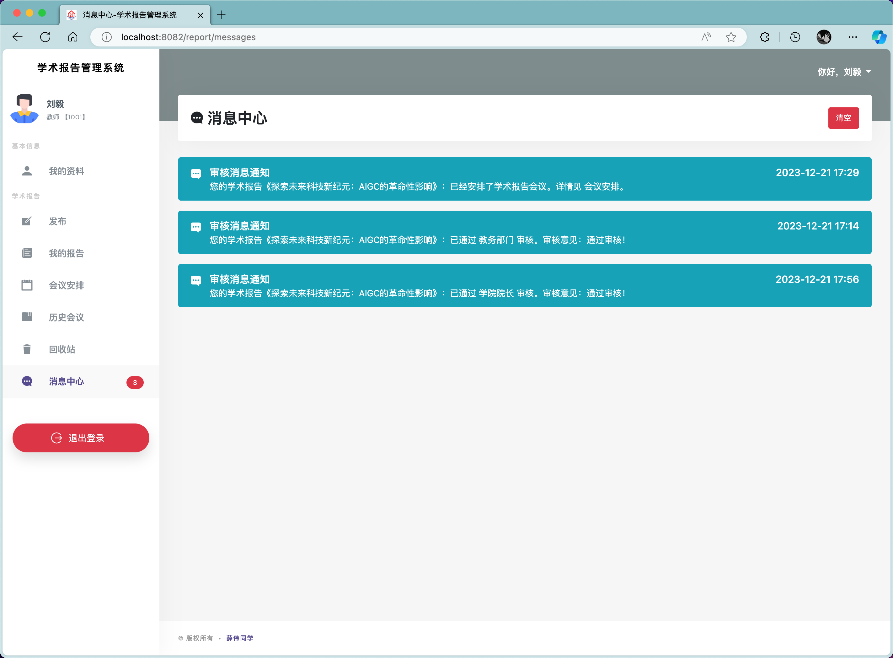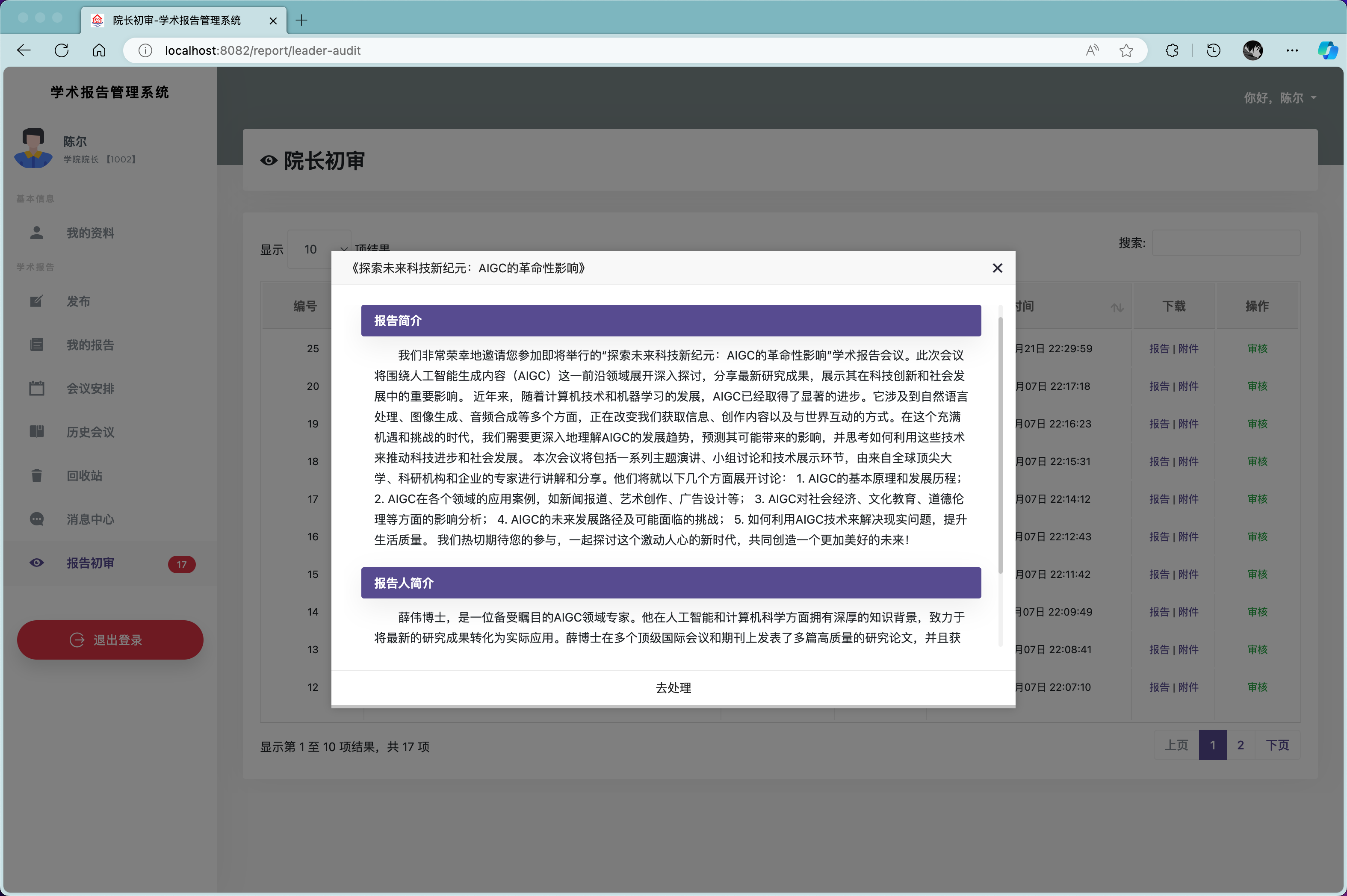 | 已通过审核 | 查询已经通过的所有学术报告列表、详情、状态等 |