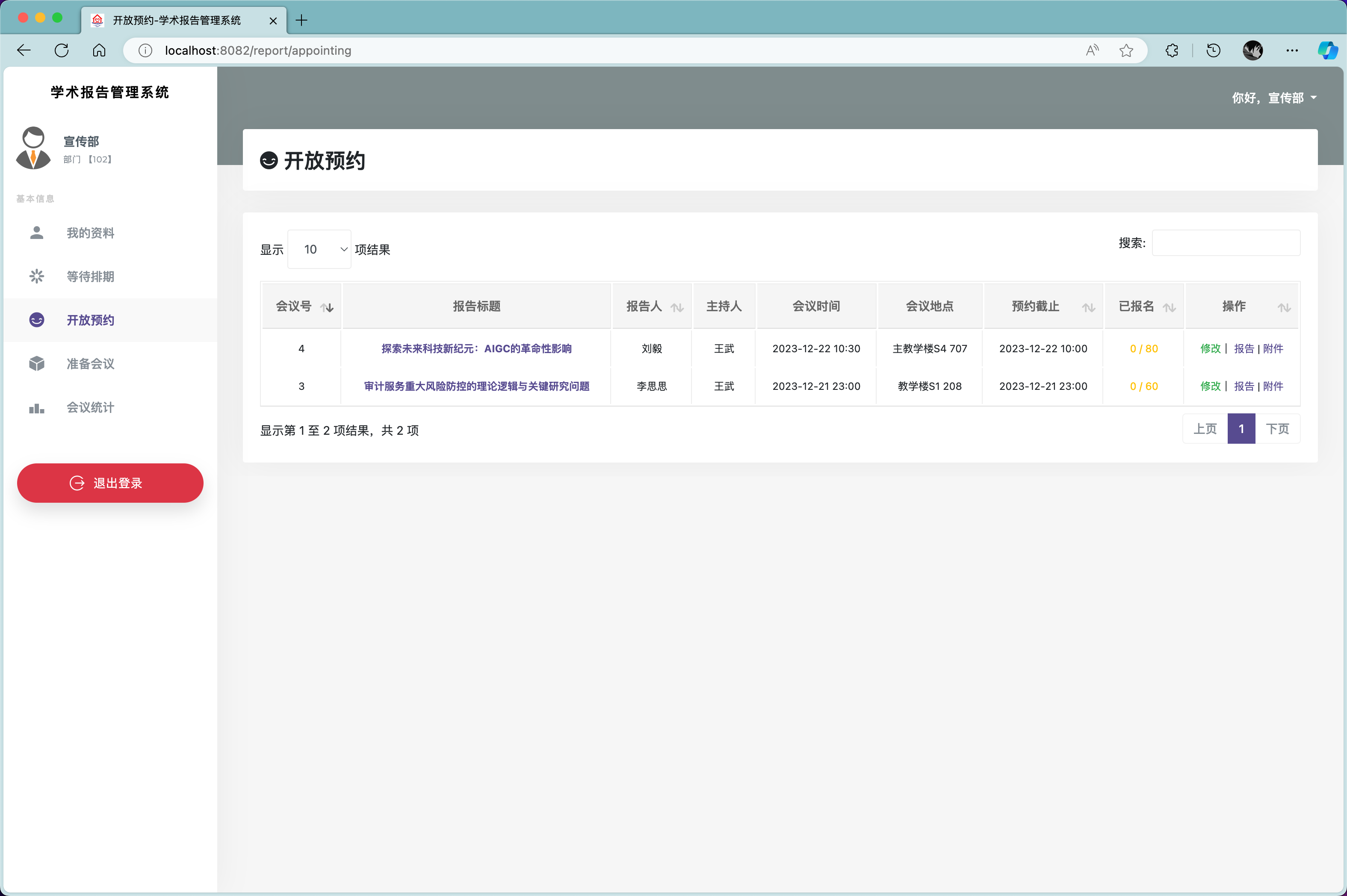 | 预约情况 | 查看本院教师的学术报告会议的预约情况,修改会议安排等 |