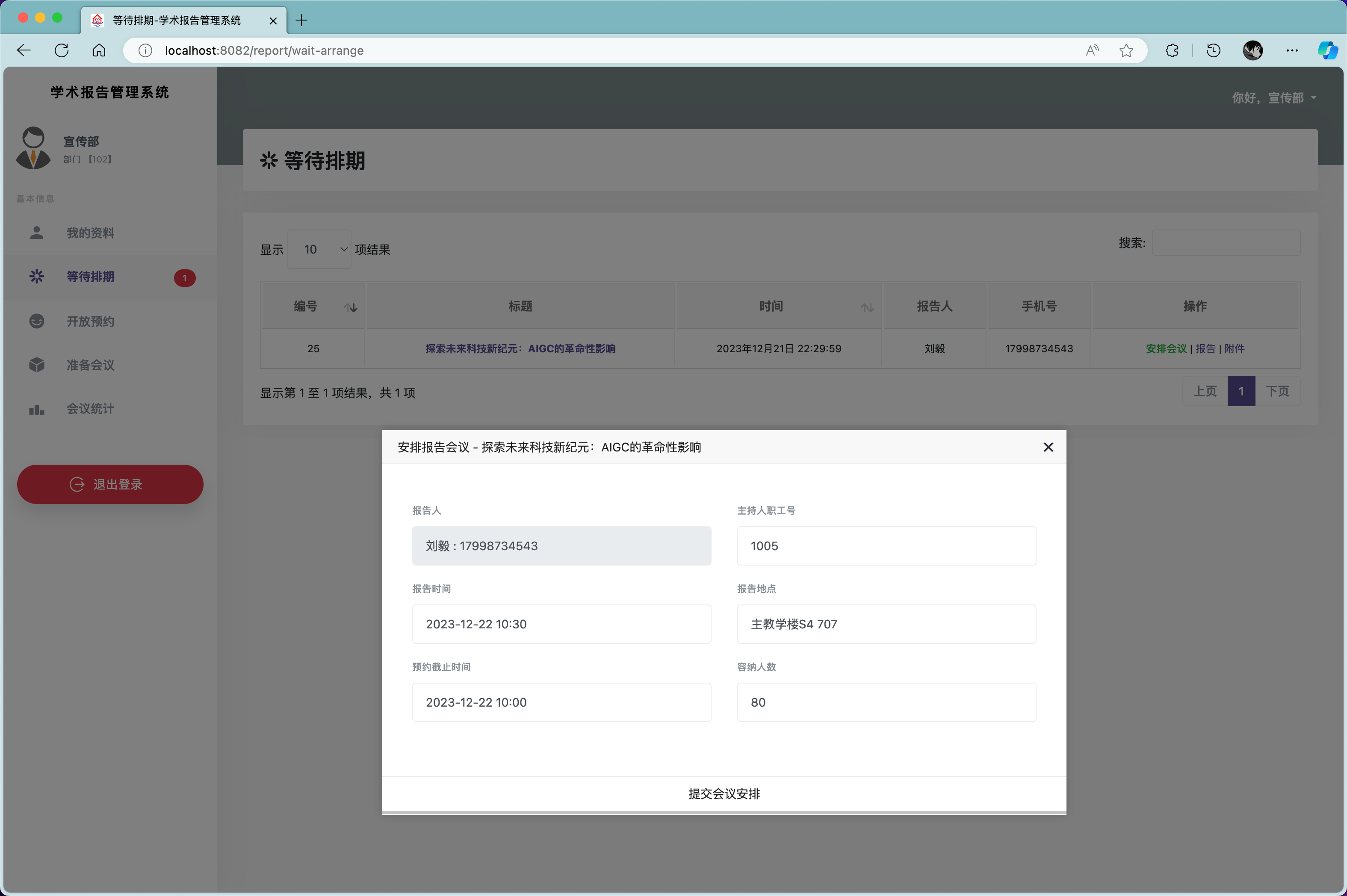 | 会议排期 | 查看本院教师提交的学术报告列表、查看报告详情、下载报告材料以及附件、安排学术报告会议(时间地点人数等,安排会议后开放预约,学生可登录系统进行预约报名) |