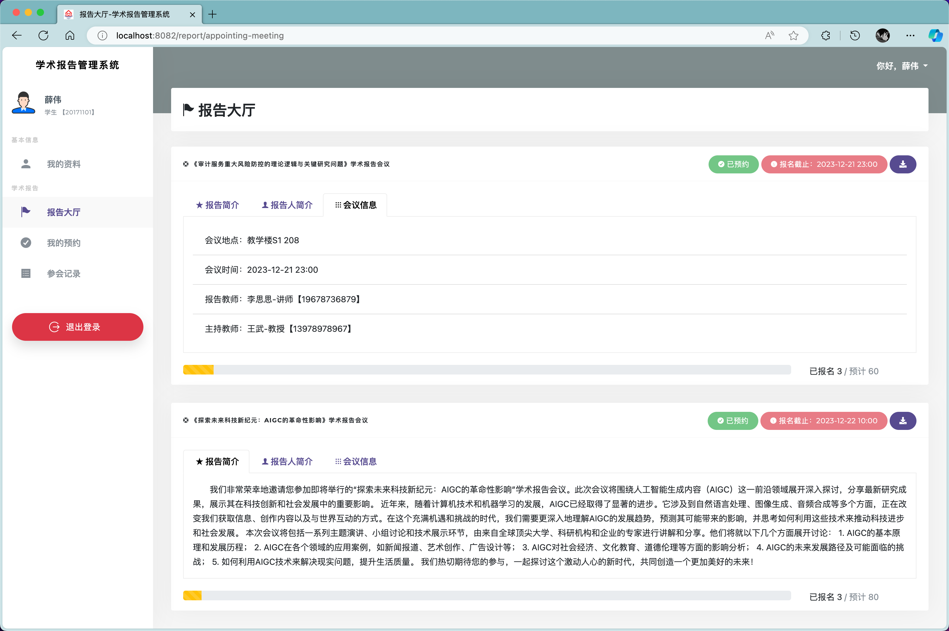 | 报告大厅 | 查看当前可报名预约的所有报告会议(简介、报告人、会议信息、报名情况、报告材料等),报名预约 |