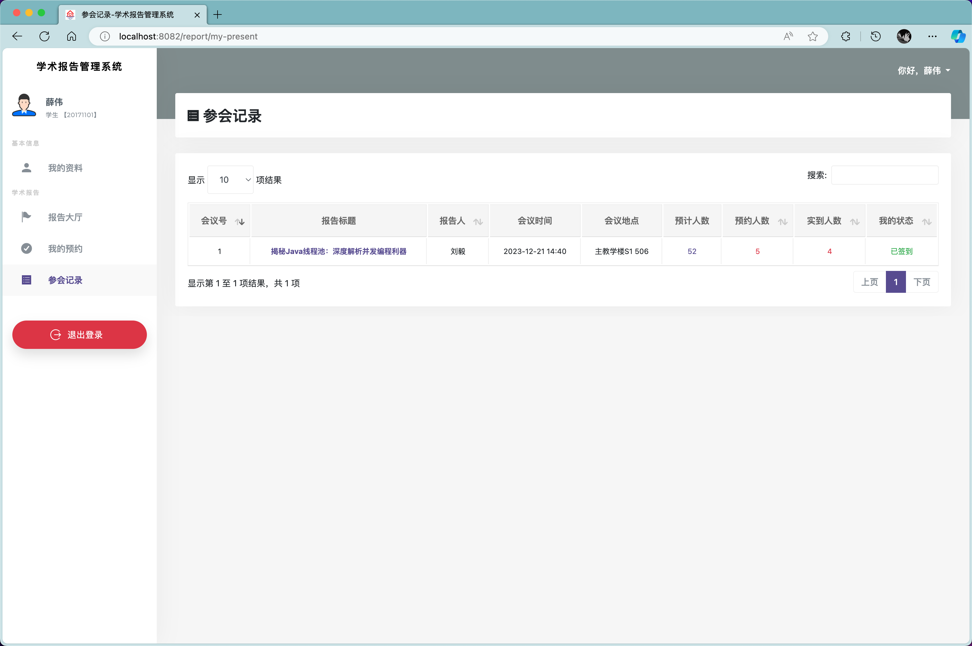 | 参会记录 | 查看自己报名参加的,已完成的学术报告会议,查看自己的签到状态(需进行线下签到并由教务部门导入签到表到系统) |