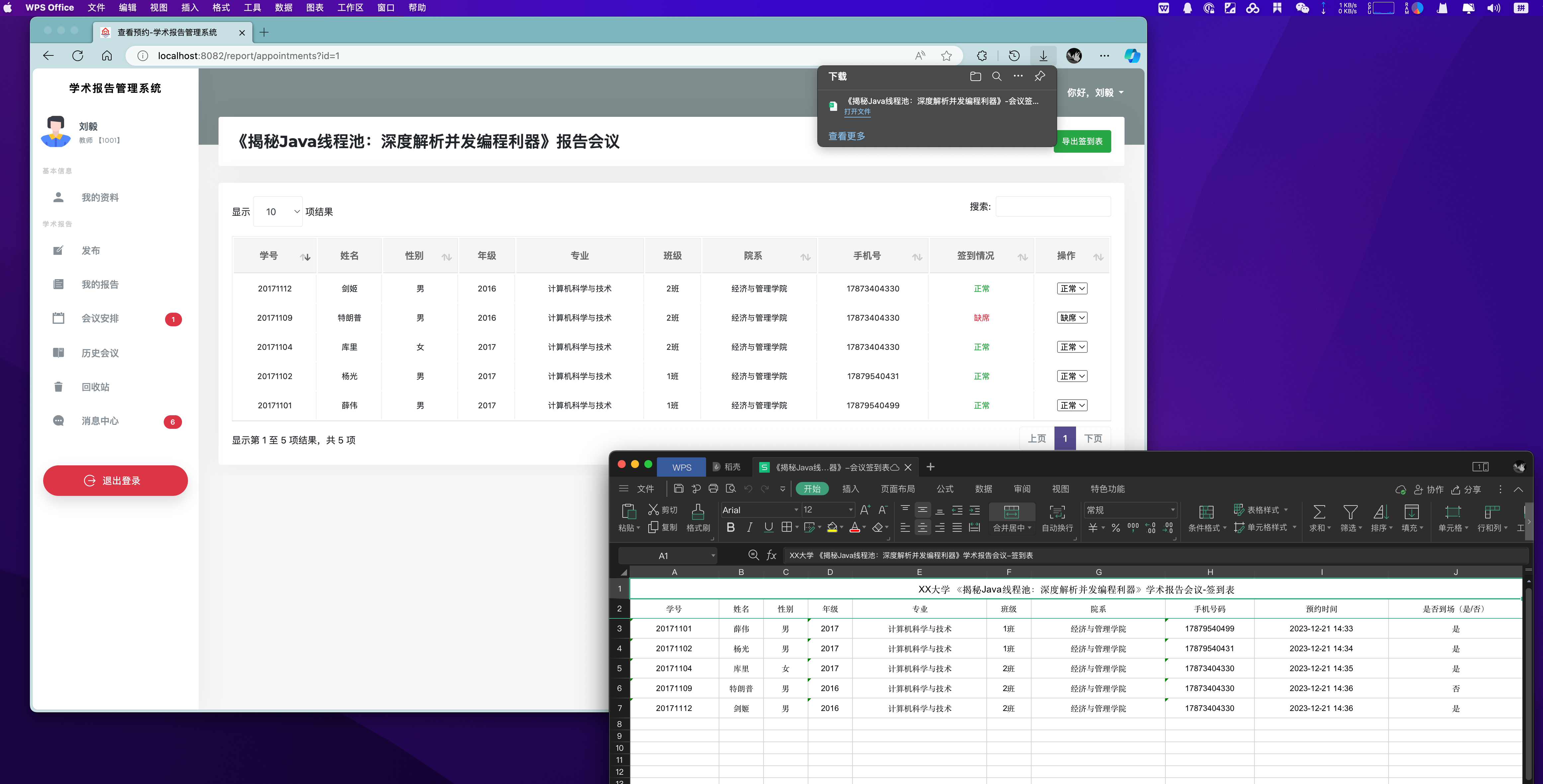 | 历史会议方面 | 系统根据报告时间自动更新会议状态,教师可查看历史会议信息、学生签到统计情况、修改学生签到状态、导出签到表等 |