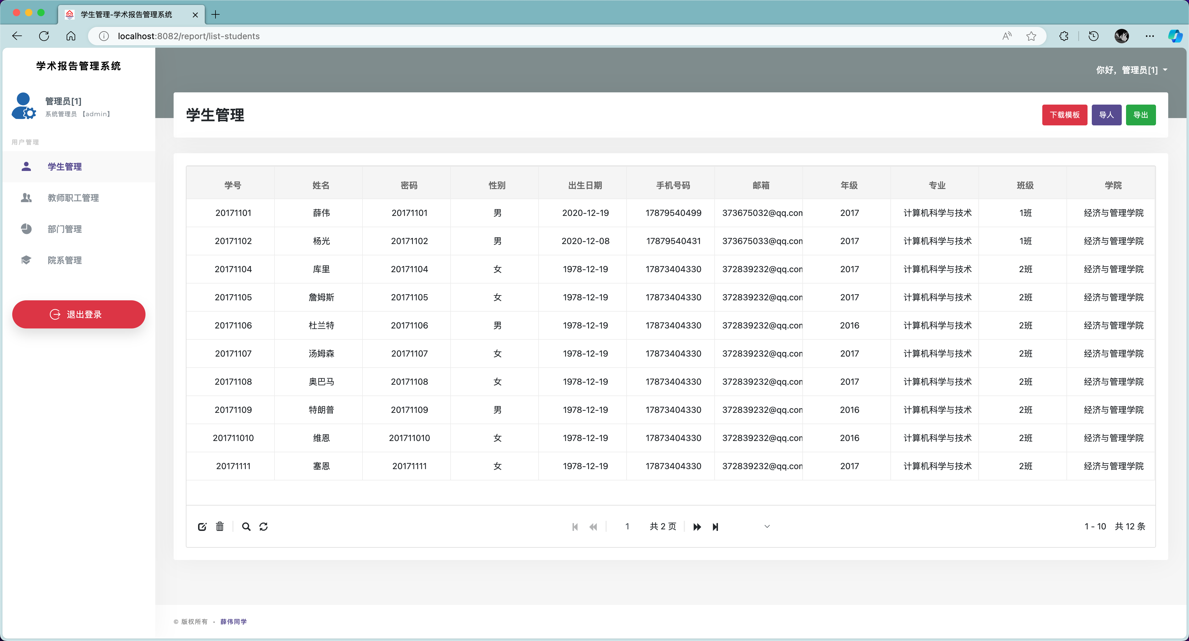 | 学生信息维护 | 多条件查询、编辑、删除、Excel批量导入、导出 |