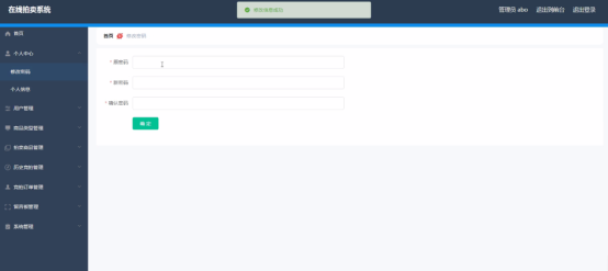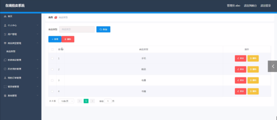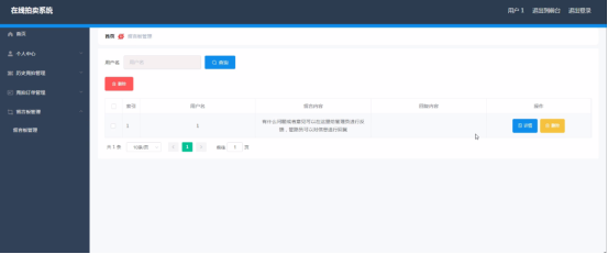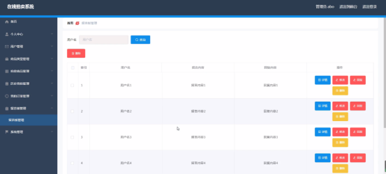 管理员:首页、个人中心、用户管理、商品类型管理、拍卖商品管理、历史竞拍管理、竞拍订单管理、留言板管理、系统管理。