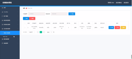 竞拍订单管理,在竞拍订单管理页面可以查看订单编号、商品名称;商品类型、成交价格、发布日期、用户名、姓名、手机、邮箱、地址、是否支付等内容,并可根据需要对竞拍订单管理进行详情,修改,删除或详细内容等操作,如图5-10所示。
