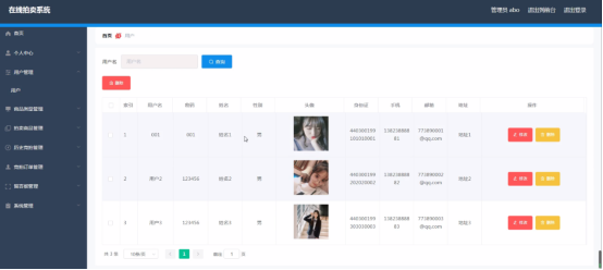 用户管理,在用户管理页面可以填写用户名、密码、姓名、性别、头像、身份证、手机、邮箱、地址等内容,并可根据需要对用户管理进行,修改或删除等操作,如图5-4所示。