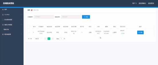 竞拍订单管理,在竞拍订单管理页面可以查看订单编号、商品名称;商品类型、成交价格、发布日期、用户名、姓名、手机、邮箱、地址、是否支付等内容,并可根据需要对竞拍订单管理进行详情,修改,删除或详细内容等操作,如图5-15所示。
