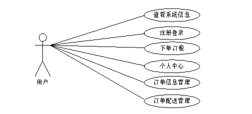 用户进入本系统可查看系统信息,包括首页、菜品信息等,用户要想实现下单订餐操作,必须登录系统,未有账号的用户可进行注册,注册登录后主要功能模块包括个人中心、订单信息管理以及订单配送管理,用户用例图如图3-1所示。