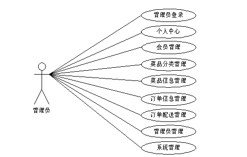 管理员登录后可对系统进行全面管理,管理员主要实现的功能模块包括个人中心、会员管理、菜品分类管理、菜品信息管理、订单信息管理、订单配送管理、管理员管理以及系统管理,管理员用例图如图3-3所示。