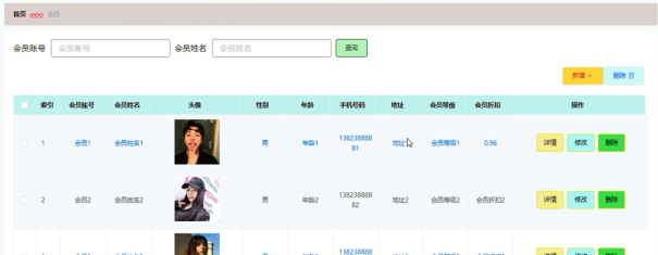 管理员可查看、添加、修改和删除会员信息,会员管理界面展示如图5-9所示。