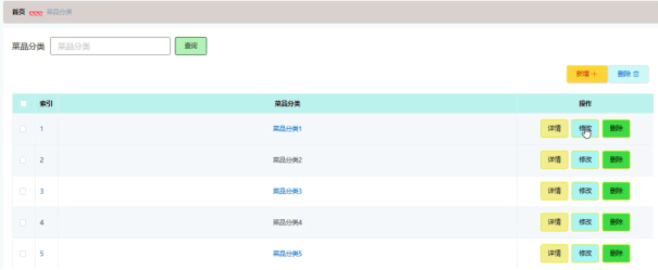 管理员能够增删改查菜品分类信息,菜品分类管理界面展示如图5-12所示。