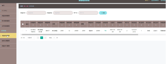 合同信息管理:通过合同信息列表可以获取合同编号、合同名称、合同类型、小区、月租价格、租用月数,租用金额。押金,房租状态。合同金额,合同内容、生效日、有限期限,用户名,联系电话,房主账号,房主姓名、是否支付、审核回复等信息。进行查看查看操作。如图5-11所示。