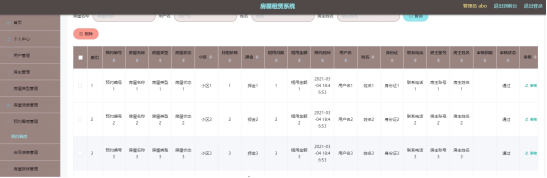 预约看房管理:通过列表可以获取预约编号、房屋名称、房屋类型、房屋状态、小区、月租价格、押金、租用月数、预约时间、用户名、姓名、身份证、联系电话、房主账号、房主姓名、审核回复、审核状态等信息,进行审核或删除操作,如图5-6所示。
