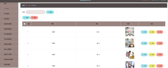 公告信息管理:通过列表可以获取公告信息的标题、简介、图片等详细信息进行修改或删除操作,并且可以通过新增公告信息进行添加公告信息,如图5-5所示。