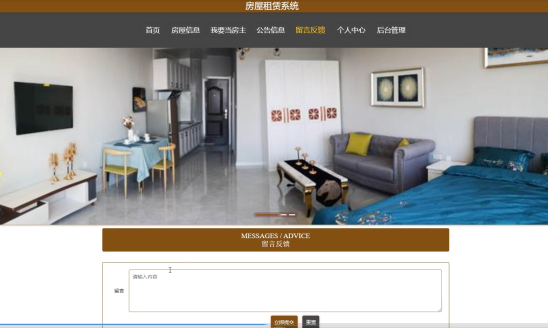 用户通过登录进入房屋租赁系统页面可以进行查看系统的首页、房屋信息、我要当房东、公告信息、留言反馈、个人中心、后台管理等功能模块进行相对应操作。,如图5-15所示。