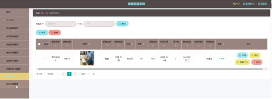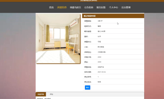 房屋信息管理:通过房屋信息列表可以查看房屋名称、房屋类型、房屋图片、出租方式、朝向楼层、面积、房屋状态、小区、详细地址、月租价格、押金、房屋设施、发布日期、房住帐号、房主姓名、等信息进行查看详细或修改或删除操作,并且可以通过查看评论进行在线回复信息或进行新增房屋信息,操作,如图54所示。