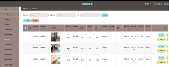 我要当房东信息:通过列表可以查看房屋名称、房屋类型、图片、租赁方式、小区、月租价格、用户名、房屋详情、朝向楼层、面积、发布日期、联系电话等信息等信息,进行查看详情或修改、删除操作,如图5-21所示。