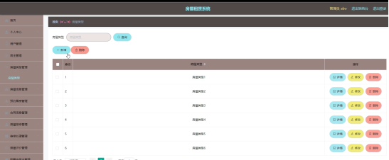房屋类型管理:通过列表可以进行查看房屋类型,进行查看详情或修改、删除操作,并通过新增进行添加类型信息,如图5-3所示。