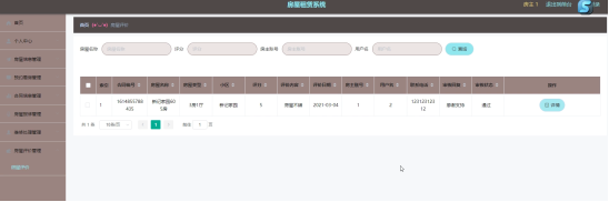 房屋评价管理:通过列表可以获取合同编号、房屋名称、房屋类型、小区、评分、评价内容、评价日期、房主账号、用户名、联系电话、审核回复、审核状态等信息,进行查看详情操作,如图5-13所示。