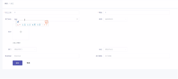 管理员可以在新员工招入时进行添加,对员工进行部门的安排和备注的添加。管理员添加员工信息的界面实现如下图4.4所示: