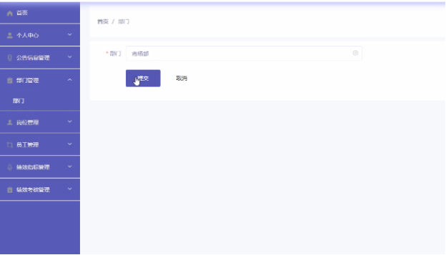 部门信息是管理员角色的功能,管理员可以为企业添加新的部门,可以查询部门的创建时间,管理员添加部门信息的实现界面如下图4.3所示: