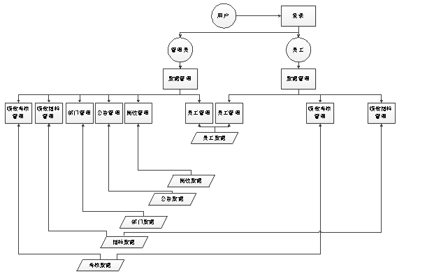 本系统的使用用户包括管理员和员工两个,管理员与员工都需要先进行登录才可以进入管理系统中,管理员和员工的账号均由企业分配,不能自主申请,防止了非法人员的侵入。管理员登录后可以进行的数据管理包括绩效指标管理、绩效考核管理、部门管理,岗位管理、公告管理以及员工管理,员工登录后的功能包括个人资料管理、绩效考核管理,绩效指标管理。两种权限的数据唯一的有岗位信息、部门信息;共享的信息包括公告信息、绩效指标信息、绩效考核信息和员工个人信息。