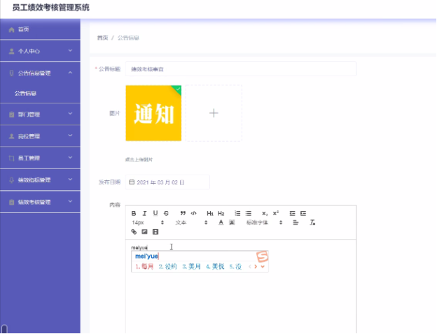 发布员工的绩效考核,绩效考核信息的实现界面如下图4.8所示: