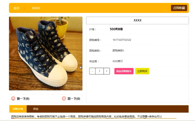 用户可选择团购查看详情信息,登录后可进行加入购物车、购买或者收藏等,团购详情界面如图5-7所示。