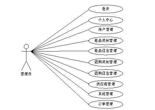 (2)管理员:管理员登录后可对系统进行全面的管理,主要功能模块包括个人中心、用户管理、商品类别管理、商品信息管理、团购类别管理、团购信息管理、供应商管理、系统管理以及订单管理。管理员用例图如图3-2所示。
