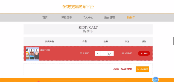 在课程信息页面通过填写课程编号、课程名称、课程类型、关键字、课时、课程详情、教师工号、教师姓名、点击次数等信息进行添加到购物车、立即购买或点我收藏等操作,如图5-17所示。在购物车页面通过填写购买商品、价格、数量、总价等信息进行点击购买或删除等操作,如图5-18所示。
