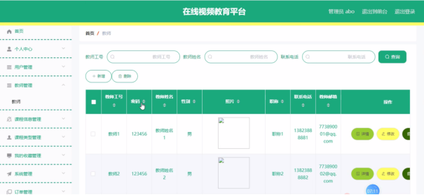 教师管理:通过列表可以获取教师工号、密码、教师姓名、性别、照片、职称、联系电话、教师邮箱等信息,进行详情、删除或修改操作,如图5-7所示。
