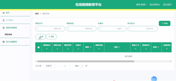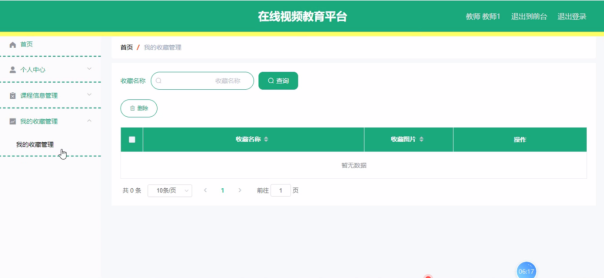 教师可以实现首页、个人中心、课程信息管理、我的收藏管理等。