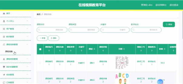 系统管理也都将通过计算机进行整体智能化操作,对于在线视频教育平台所牵扯的管理及数据保存都是非常多的,例如管理员;首页、个人中心、用户管理、教师管理、课程信息管理、课程类型管理、我的收藏管理、系统管理、订单管理,用户;首页、个人中心、课程信息管理、我的收藏管理、订单管理、教师;首页、个人中心、课程信息管理、我的收藏管理,前台首页;首页、课程信息、个人中心、后台管理、购物车等功能,这给管理者的工作带来了巨大的挑战,面对大量的信息,传统的管理系统,都是通过笔记的方式进行详细信息的统计,后来出现电脑,通过电脑输入软件将纸质的信息统计到电脑上,这种方式比较传统,而且想要统计数据信息比较麻烦,还受时间和空间的影响,所以为此开发了在线视频教育平台;为用户提供了方便管理平台,方便管理员查看及维护,并且可以通过需求进行内容的编辑及维护等;对于用户而言,可以随时进行查询所需信息,管理员可以足不出户就可以获取到系统的数据信息等,而且还能节省用户很多时间,所以开发在线视频教育平台给管理者带来了很大的方便,同时也方便管理员对用户信息进行处理。