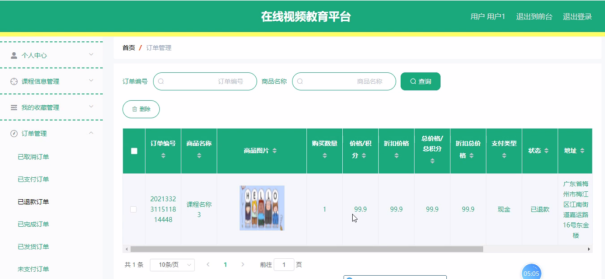 用户可以实现首页、个人中心、课程信息管理、我的收藏管理、订单管理等。