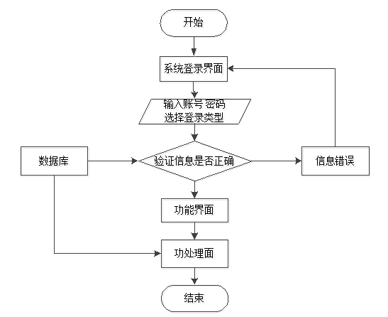用户想进入系统,首先进入系统登录界面,通过正确的用户名、密码,选择登录类型登录,系统会检查登录信息,信息正确,然后输入相应的功能界面,提示信息错误,登录失败。系统操作流程如图3-4所示。