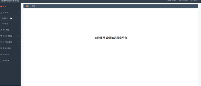 3、用户:首页、个人中心、笔记分享管理、个人笔记管理、我的收藏管理。