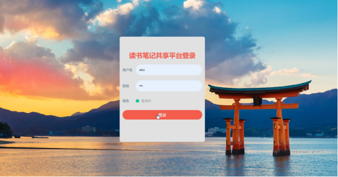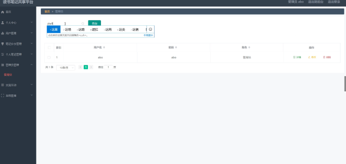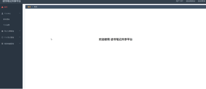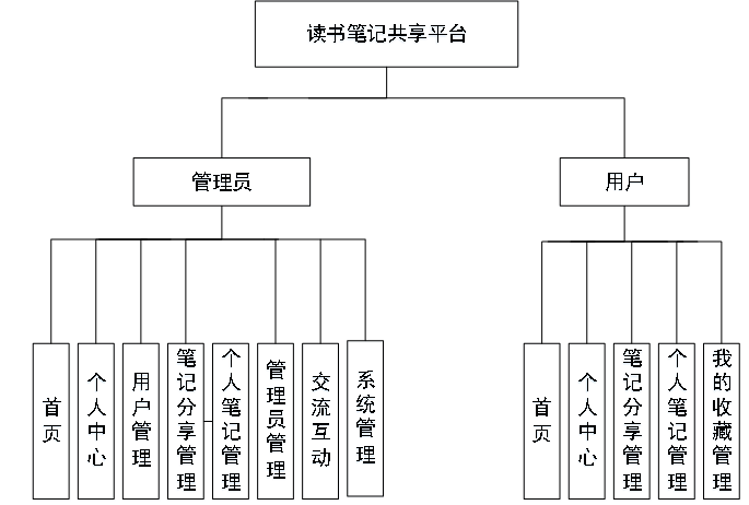 读书笔记共享平台,主要包括管理员、用户二个权限角色,对于用户角色不同,所使用的功能模块相应不同。