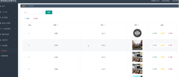 公告信息:管理员通过公告信息页面可以查看索引、标题、简介、图片、操作等信息,并进行详情、删除、修改操作如图5-8所示。