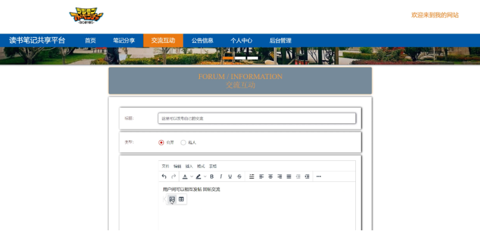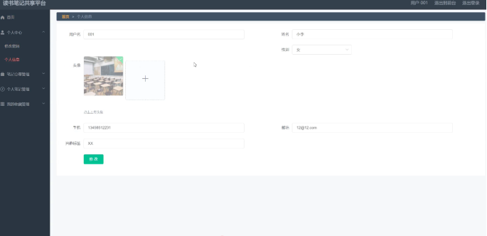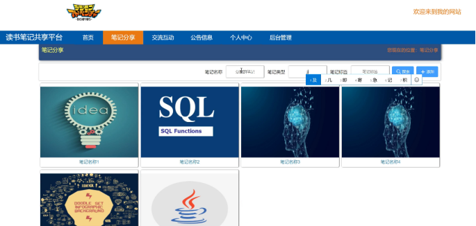 4、前台首页:首页、笔记分享、交流信息、个人中心、后台管理等相应操作;