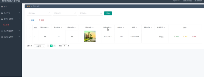 笔记分享,在笔记分享页面通过填写笔记名称、笔记类型、笔记标签、笔记图片、分享日期、用户名、邮箱、审核回复、审核状态等信息进行搜索、添加,如图5-11所示。