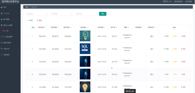 笔记分享管理,用户通过笔记分享管理可以查看笔记名称、笔记类型、笔记标签、笔记图片、分享日期、用户名、邮箱、审核回复、审核状态等信息,进行详情修改或删除,如图5-15所示。
