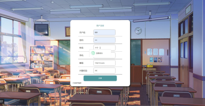 登录、用户注册,在用户注册页面可以填写用户名、姓名、性别、头像、手机、邮箱、兴趣标签等信息进行注册,如图5-10所示。
