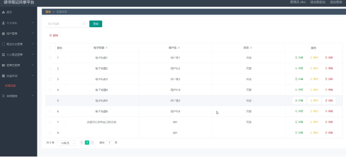 交流互动:管理员在通过交流互动页面可以查看帖子标题、用户名、状态、操作等信息,并进行详情、删除、修改操作如图5-7所示。