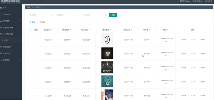 个人笔记管理:管理员在通过个人笔记管理页面可以查看笔记名称、笔记类型、笔记标签、笔记图片、发布日期、用户名、邮箱等信息,并进行详情、删除、修改操作,如图5-6所示。