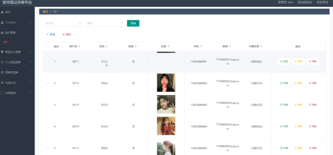 用户管理:管理员通过在用户管理进入页面可以查看用户名、姓名、性别、头像、手机、邮箱、兴趣标签等并进行详情、删除、修改操作如图5-3所示。