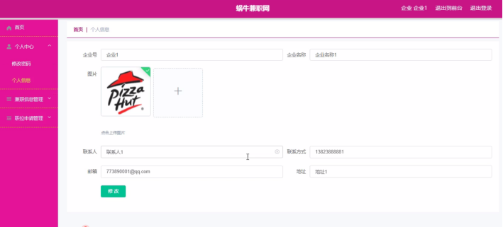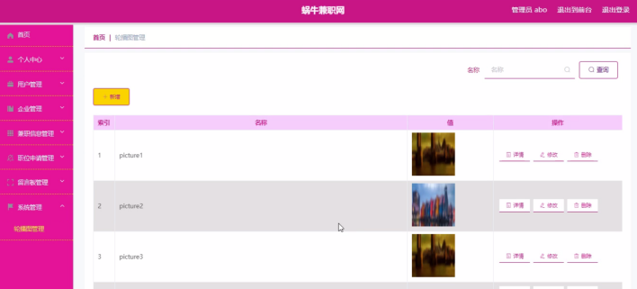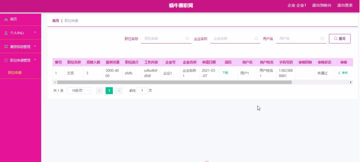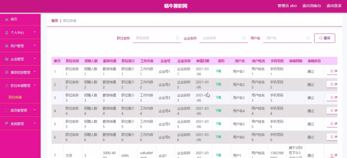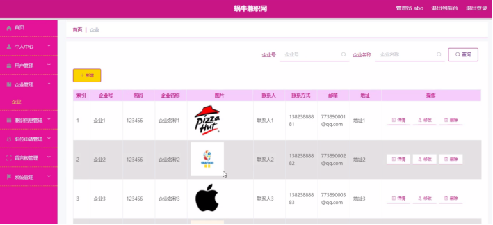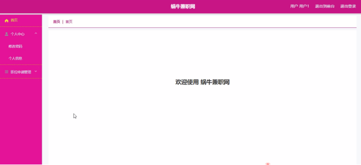 管理员登录进入蜗牛兼职网可以查看首页、个人中心、用户管理、企业管理、兼职信息管理、职位申请管理、留言板管理、系统管理等信息。