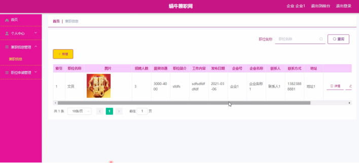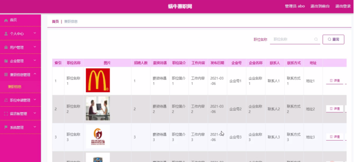兼职信息管理,在兼职信息管理页面中可以查看职位名称、图片、招聘人数、薪资待遇、职位简介、工作内容、发布日期、企业号、企业名称、联系人、联系方式等信息,并可根据需要对兼职信息管理进行详情、修改或删除等操作,如图5-4所示。