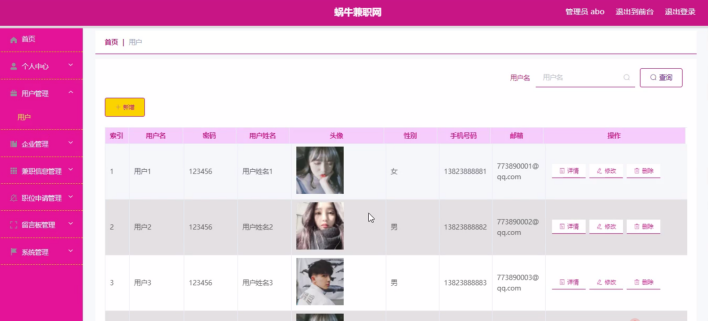 用户管理,在用户管理页面中可以通过填写用户名、密码、用户姓名、头像、性别、手机号码、邮箱等信息进行详情、修改、删除等操作,如图5-2所示。还可以根据需要对企业管理进行详情、修改或删除等详细操作,如图5-3所示。